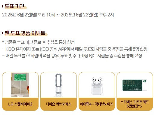 투표 기간 동안 매일 투표하면 자동 응모되며, 추첨을 통해 LG 스탠바이미 GO, 다이슨 헤어드라이어 등 다양한 경품이 제공됩니다. 당첨자는 투표 종료 후 발표됩니다.