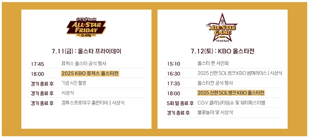 2025 KBO 올스타전은 7월 11일(금) 퓨처스 올스타전과 홈런더비, 7월 12일(토) 팬 사인회, 썸머레이스, 본 경기로 구성되어 있습니다. 장소는 대전 한화생명 이글스파크이며, 전반기 마지막 경기 후 6일간의 올스타 브레이크가 이어집니다. 다양한 현장 이벤트와 사인회, 홈런레이스 등 풍성한 프로그램이 준비되어 있어 팬들에게 최고의 추억을 선사합니다.