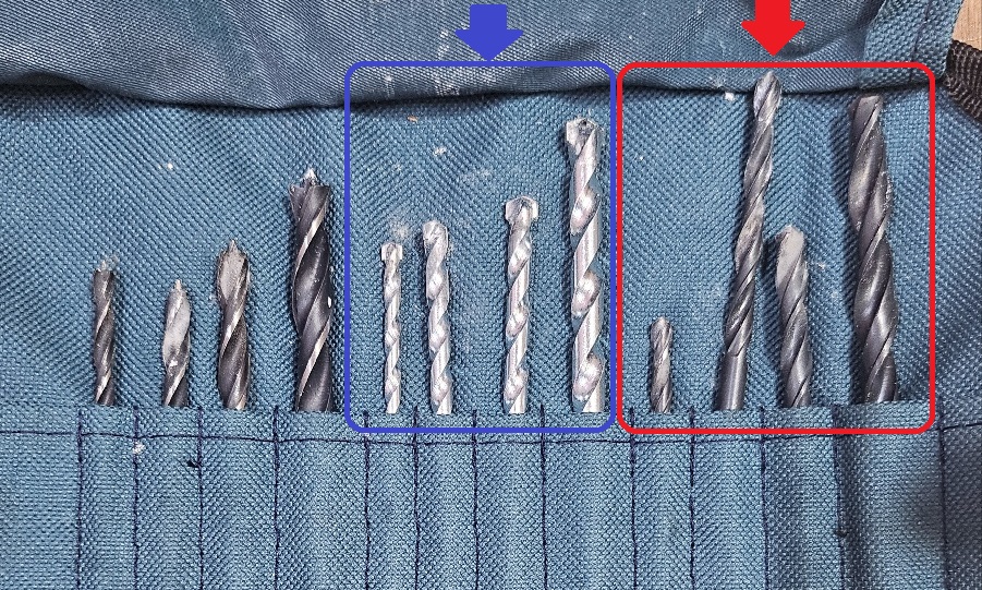 먼저 콘크리트 벽을 뚫기 위해서는 비트를 2가지 사용해야 합니다. 붉은색 사각형의 비트가 구멍을 내는 비트입니다. 그럼 파란색은? 구멍을 넓히면서 깊게 뚫어주는 역할을 합니다. 붉은색을 1번 비트, 파란색을 2번 비트라고 지칭하고 나중에 작업 순서를 설명하겠습니다.