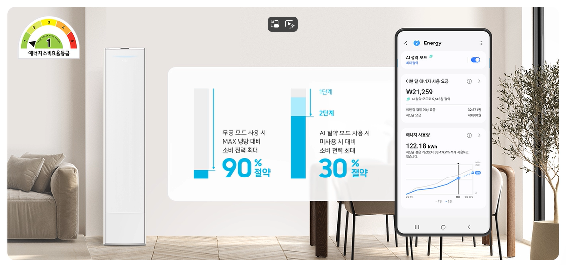 - AI 에너지 절약 모드: 스마트한 인공지능 제어로 일반 모드 대비 전력 소비를 최대 30% 절감하며, 특히 무풍 모드 사용 시에는 놀라운 77%까지의 에너지 절약이 가능한 친환경 운전을 실현합니다.