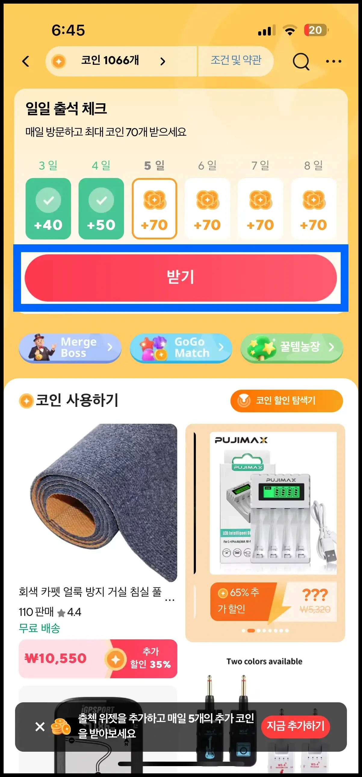 - '받기' 버튼을 터치하면 코인이 적립됩니다.