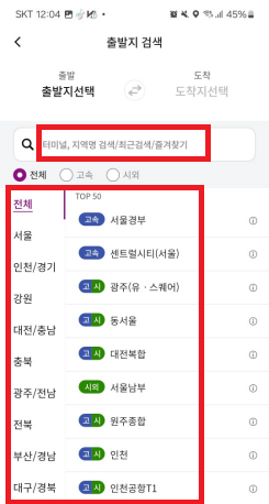 - '출발지' 입력란을 탭하고 출발할 터미널을 선택합니다.