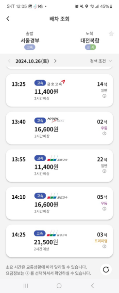 - 조회 결과 화면에서 원하는 출발 시간과 좌석 등급을 확인합니다.