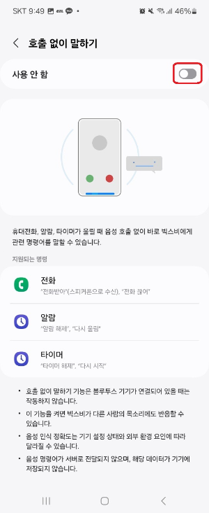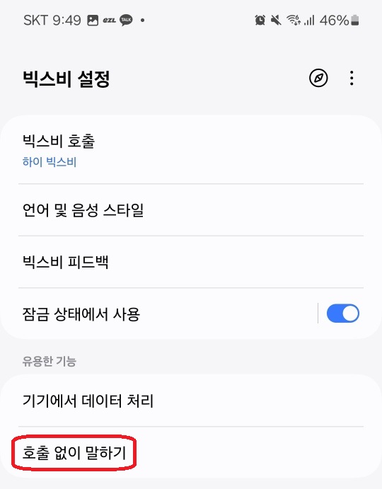 빅스비 설정에서 호출 없이 말하기 기능을 선택합니다.