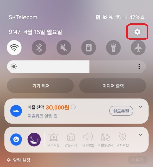 먼저 휴대전화의 설정 모드로 들어갑니다. 설정은 화면을 내리면 오른쪽 상단에 톱니모양의 아이콘이 설정 버튼입니다.