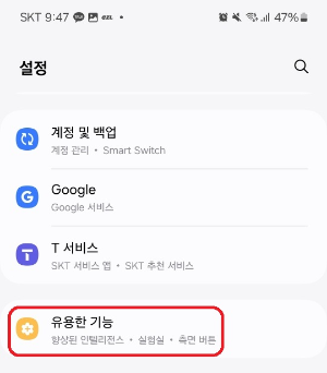 설정 탭에서 손가락으로 위로 드래그 하여 유용한 기능을 찾아 선택하여 줍니다.