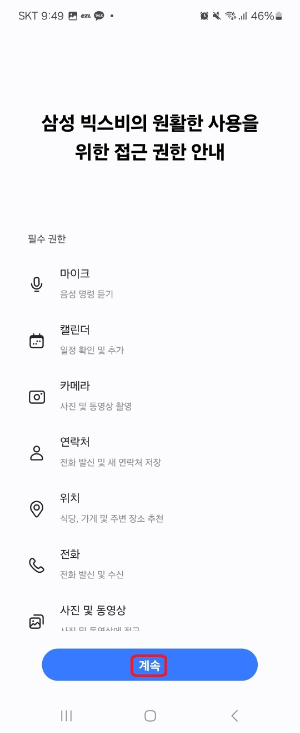저는 휴대전화를 바꾼 다음 빅스비 기능을 처음 사용하기 때문에 권한 허용을 진행합니다. 이미 빅스비 기능을 사용 중인 분들은 이 단락을 넘어가시면 되겠습니다.