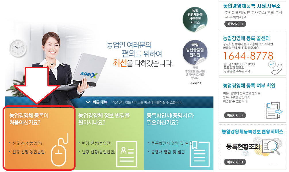 - 홈페이지 내에서 '농업경영체 등록' 온라인 서비스를 선택합니다.