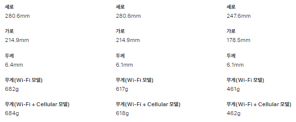 크기가 13인치로 동일하게 출시되었음에도 불구하고 기존 프로 6세대 모델보다 두께는 0.3mm 출어 들어 6.1mm로 출시되었습니다. 무게 또한 6세대 프로모델과 비교하였을 때 와이파이 모델은 65g 줄어들어 617g이고, 셀룰러 모델은 618g으로 66g 줄어들었습니다.