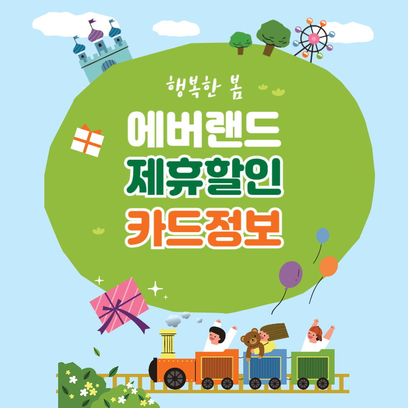 따뜻한 봄이 왔습니다. 셀레는 봄에는 나들이 가기가 좋습니다. 아이들과 함께여도 좋은 에버랜드를 가보시는건 어떨까요? 다양한 꽃 축제부터 빛나는 퍼레이드까지 아이들과 함께 즐긴다면 잊지 못할 하루를 선물하게 될 것입니다. 물론 제휴 할인 카드 정보는 미리 알고 가시면 더욱 좋습니다. 할인되는 대표 3개 카드사 정보를 아래에서 확인해 보세요.