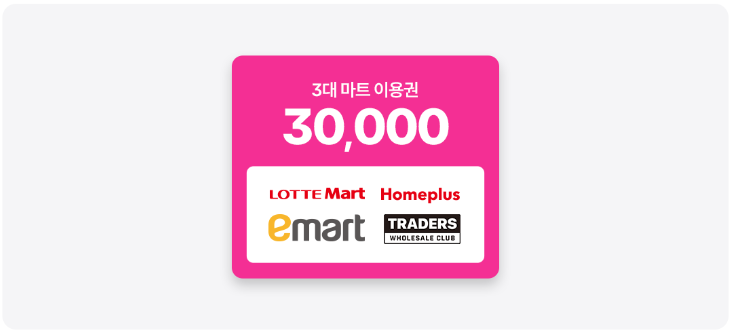 1만 5천원 요금제 이상 가입 시 3만 원 마트 이용권이 제공됩니다. 롯데마트, 홈플러스, 이마트, 트레이더스 중 1가지를 선택하여 받을 수 있습니다. 유심 당일 배송 신청으로 가입 시 3만 원입니다. 편의점, 마트, 오픈마켓으로 가입하면 2만 원권으로 지급받을 수 있습니다.