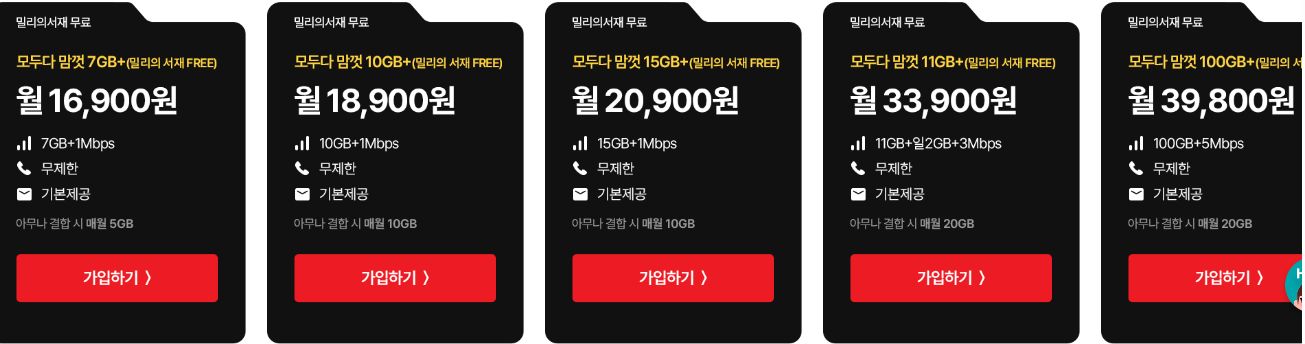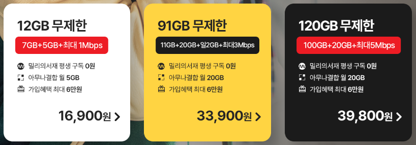 총 3가지 요금제가 요즘 이벤트 중이면서 대표적인 요금제여서 메인 화면에서 바로 볼 수 있습니다. 사진에서 볼 수 있듯이 3개 요금제 모두 밀리의 서재 평생 구독 0원입니다. 12GB 무제한 요금제는 16,900원, 91GB 무제한 요금제는 33,900원 120GB 무제한 요금제는 39,800원입니다.
